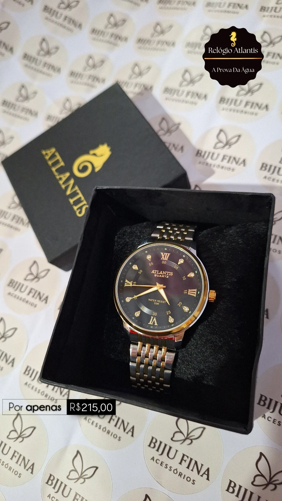 Relógio Atlantis Quartz com esfera preta, marcadores em zircônia e detalhes em banho dourado. Pulseira de aço bi-tone (prata e dourado) confere brilho e sofisticação. Movimento quartzo preciso, caixa robusta e resistência à água de até 50m. Estilo clássico para o dia a dia, trabalho ou ocasiões especiais. Embalagem premium pronta para presentear.